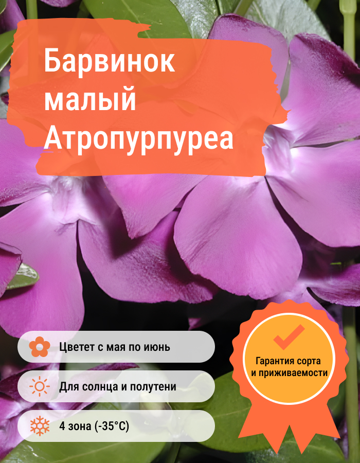 Рассада барвинка Atropurpurea (Атропурпуреа) разрастается в ширину до 60 см, а в высоту поднимается лишь на 30 см. Листочки густо покрывают веточки. Они небольшие, кожистые и имеют темно-зеленый цвет. Зацветает растение из семян барвинка Atropurpurea в мае. На протяжении месяца кустарник усеян фиолетово-пурпурными цветочками, состоящие из пяти лепестков. Иногда растение цветет повторно. Достоинства рассады барвинка Atropurpurea: может расти в полной тени и на солнце, только тогда нужен обильный полив, хорошо переносит морозы, не нуждается в укрытии. Больше всего подходит дренированная и увлажненная почва.