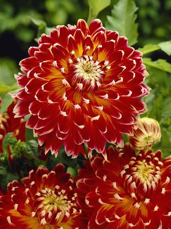Клубни георгины махровой Акита (Dáhlia variabilis Akita) позволят вырастить на приусадебном участке куст, который с июля по сентябрь будет радовать цветами диаметром от 10 до 12 сантиметров. Цветы поражают необычной расцветкой. Основной тон лепестков красный, края украшены едва заметной белой каймой. Поэтому издали кажется, что они покрыты серебристым налетом. Высота куста достигает от 60 до 100 сантиметров. Растения высаживают одиночно или группами, их используют для создания миксбордеров. Кусты подвязывают к опоре, иначе стебли могут падать на землю под тяжестью цветков.