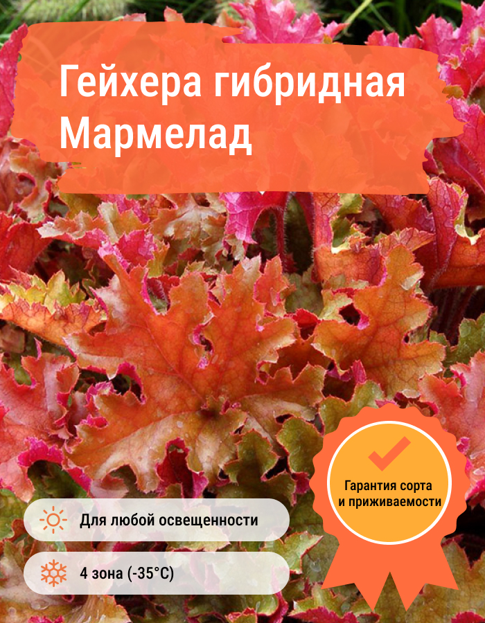 Рассада гейхеры Мармелад (Marmalade) поражает удивительной окраской и формой листвы – гофрированные резные листья пестрят красными, зелеными и оранжевыми тонами. И без того эффектный вид летом дополняется мелкими кремово-желтыми цветочками, собранными в соцветия-метелки. Этот сорт отлично сочетается с другими декоративными растениями.