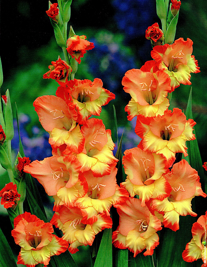 Гладиолус гибридный Принцесса Маргарет Роуз (Princess Margret Rose) удивительное растение с цветками необычного окраса. Из центра цветка, окрашенного в насыщенный желтый оттенок, выплывает волна красного цвета, как будто само солнце подарило растению свою силу. Высота цветоноса достигает 80 сантиметров, соцветие густое, размер цветков средний. Отлично смотрится в миксбордерах и на отдельных клумбах, причем желательно высаживать луковицы достаточно далеко друг от друга. Предпочитает расти на хорошо освещенных солнцем местах, в сухое время требует дополнительного полива. Этот сорт гладиолуса – настоящее украшение сада, долго стоит в срезанном виде.