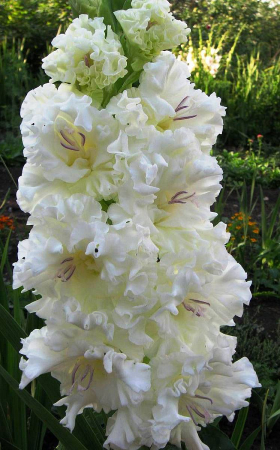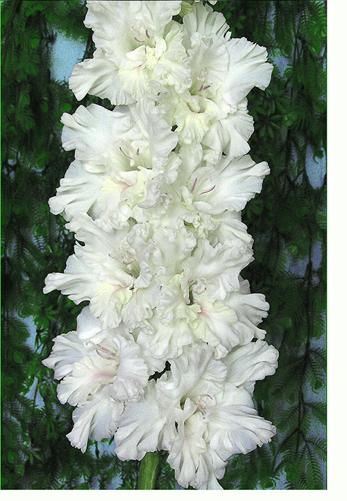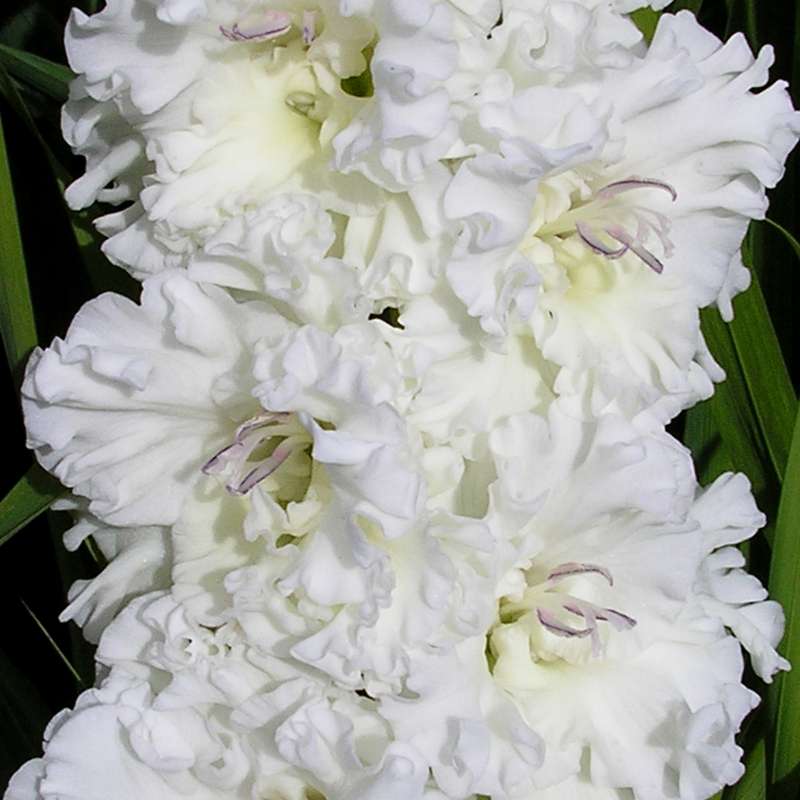 Луковицы Гладиолуса гибридного Снов Фриззле (Snowy Frizzle) обязательно стоит приобрести, чтобы почувствовать легкий аромат и насладиться необычайно красивыми цветками. Высота растения достигает 90–120 сантиметров. Стебли у него прямостоячие и крепкие. Одновременно распускаются 7–8 цветков белоснежного цвета с зеленоватой серединкой и 3 сиреневыми тычинками. Лепестки гофрированные, поэтому соцветие выглядит очень пышным и нарядным. Листья темно-зеленые, линейные. Они контрастируют с цветками и подчеркивают их воздушность. Растение практически не подвержено садовым заболеваниям.
