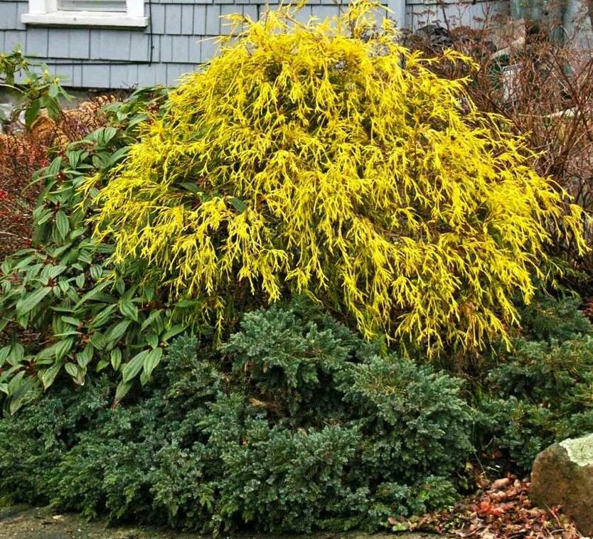 Саженцы кипарисовика горохоплодного Филифера Аурена (Filifera Aurea) притягивают взгляды приятным золотисто-зеленым оттенком хвои на слегка спадающих ветвях. Высота взрослого растения 2м. Хвоя чешуйчатая, побеги густые, неравномерно сформированные. Форма кроны живописно развесистая усеянная круглыми коричневыми шишками. Темп годового прироста – медленный, около 5 см в высоту. Кипарисовик горохоплодный Филифера Аурена хорошо подходит для украшения японского сада и небольших участков.
