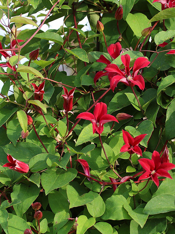 Саженцы клематиса гибридного Гравити Бьюти (Gravetye Beauty) предпочитают солнечные или слегка затененные места с легкими и водопроницаемыми почвами богатыми питательными веществами. Оригинальные багровые тюльпановидные цветки распускаются на лиане с июля по август. По окончании цветения побеги украшают декоративные соплодия. Высота растения достигает 200-300 см. Для поддержания растения в вертикальном положении нужна опора. Клематис гибридный Гравити Бьюти (Gravetye Beauty) применяют для декорирования садовых построек, при создании клуб и композиций.