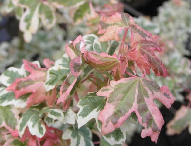 Саженцы Клёна полевого Карнивал (Carnival) представлены в виде дерева или кустарника, высота которого может достигать 5 метров. Крона густая, раскидистая и отличается своим необычным окрасом: каждый листок имеет салатово-зеленую сердцевину, которая вокруг украшена окантовкой кремово-белого цвета.