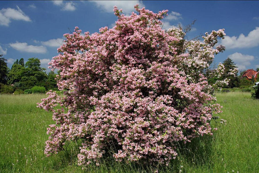 Рассада кольквиции прелестной (Kolkwitzia amabilis) вырастает в шикарный куст с немного опущенными ветвями и густой кроной. Кустик напоминает огромный шар. Листва темно-зеленого тона, широкая, продолговатая. Цветет колокольчатыми цветочками, которые густо покрывают весь куст. Достоинства кольквиции прелестной: