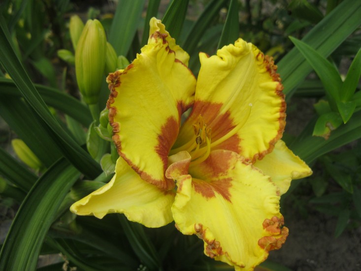 Многолетник цветет на протяжении всего лета. Растение данного сорта вырастает до 65 сантиметров. Размер яркого эффектного цветка достигает 15-18 сантиметров. Лилейник обладает сочной желтой окраской, по центру – оранжево-красный глазок, этого же цвета гофрированные края лепестков. Каждый цветок живет 1-2 дня, но большое количество бутонов на каждой ветке делает цветение практически непрерывным на протяжении всего сезона цветения.