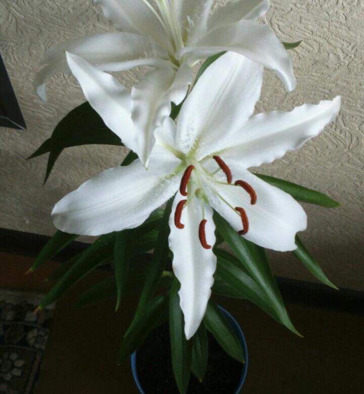 Окраска цветка : белоснежный, насыщенно-оранжевые пыльники, лепестки волнистые по краям