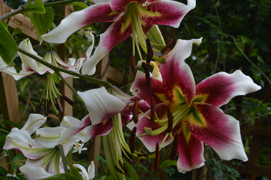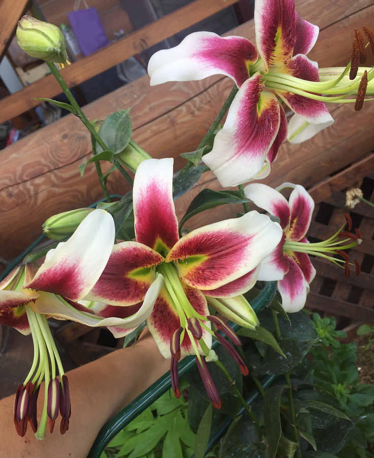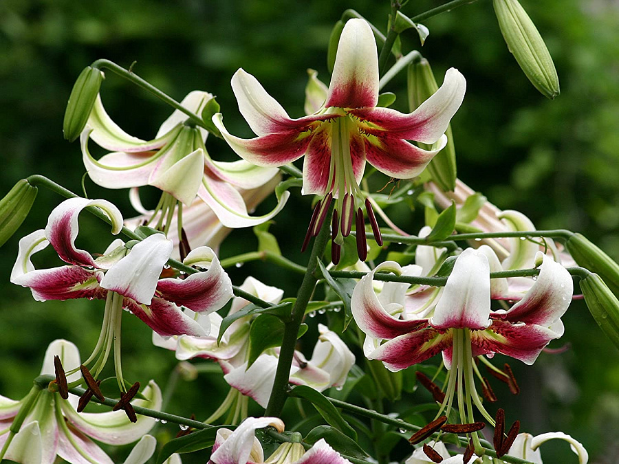 Саженцы и рассада лилии от-гибрид Лесли Вудриф (Lilium OT-hybrid Lesley Woodriff) станут украшением вашего сада. При правильном уходе взрослые растения образуют на стеблях до 20 больших ароматных цветков диаметром 25 см, которые раскрываются в августе. Лепестки изящно загнуты, имеют насыщенный вишневый цвет с белыми краями и зеленовато-желтым оттенком у центра цветка.