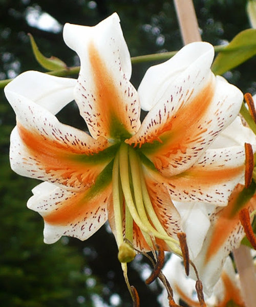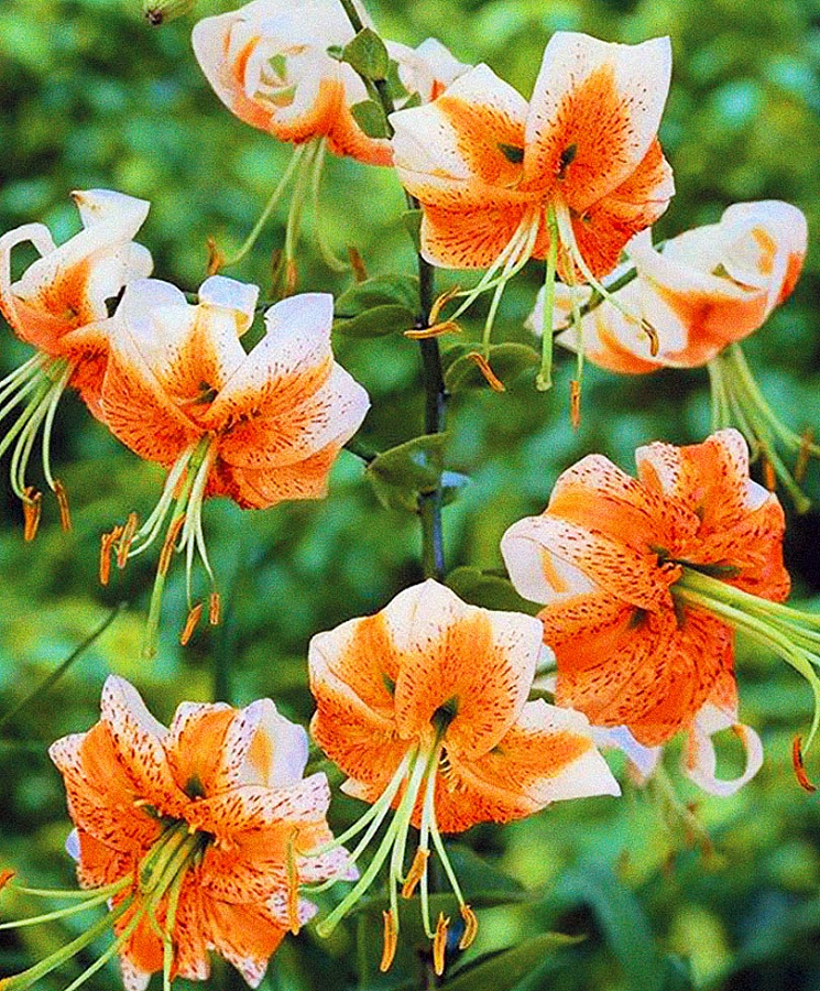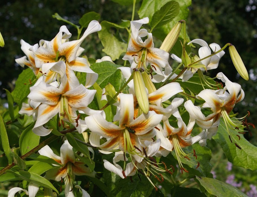Лилия видовая Леди Элис - это изысканное растение, которое поражает своей красотой и изяществом. Ее стебель достигает высоты до 120 см, а цветки имеют диаметр до 17 см. Они окрашены в кремовато-белый цвет с апельсиново-оранжевым центром, что создает неповторимый и яркий образ. Листья лилии Леди Элис имеют интересную форму, что делает растение еще более привлекательным.
