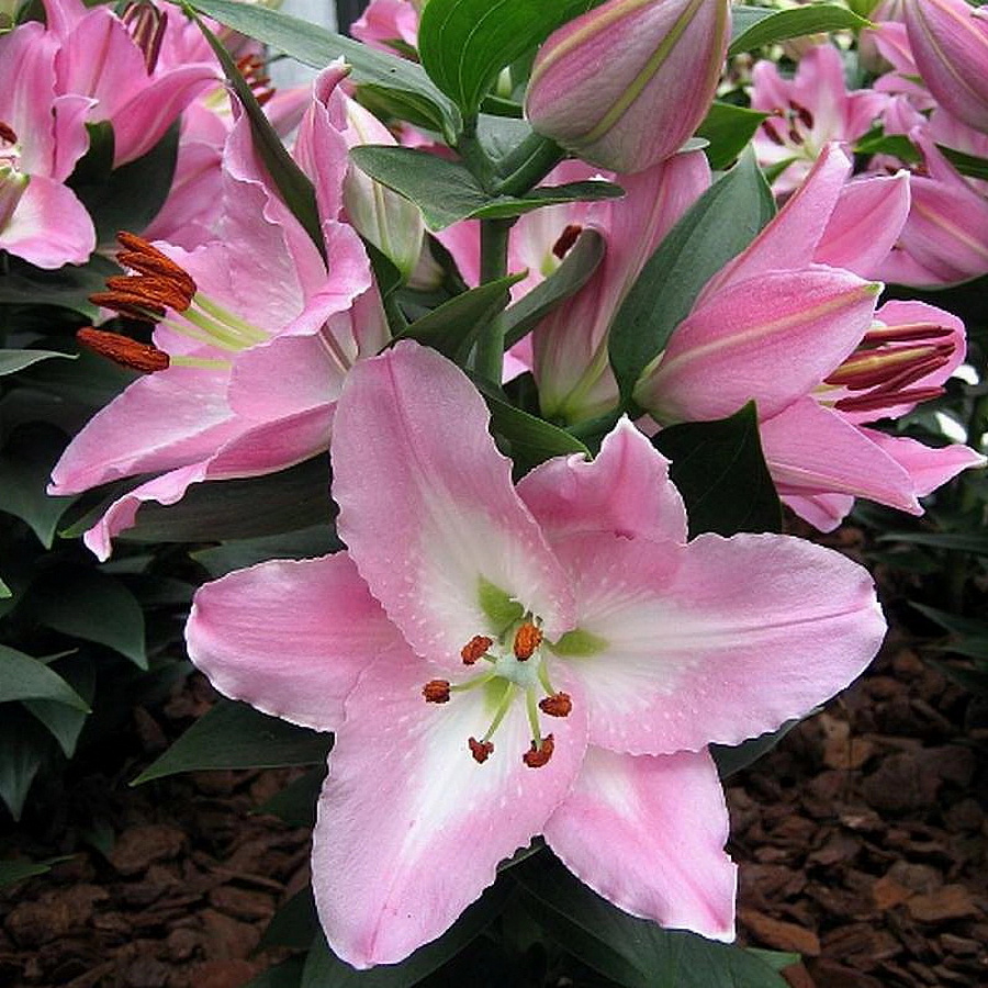 Саженцы и рассада Лилии восточной горшечной Сувенир (Lilium oriental Souvenir) подарят клумбам экзотическую привлекательность. Огромные цветы яркой раскраски на коротких стеблях около 40 см с сильным ароматом покорят каждого любителя буйства красок своей нежностью и размерами. Идеальным местом для посадки будет рыхлая, богатая питательными веществами известковая песчано-глинистая почва с расположением в теплом солнечном или полутеневом месте. Также нужен хороший дренаж. Цветы требуют укрытия на зиму, отлично смотрятся в групповых и смешанных посадках на открытом грунте.