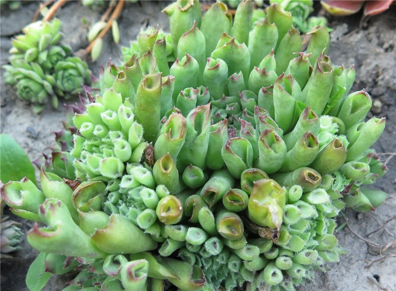 Рассада молодила Оддити (Oddity) имеет зеленый окрас листьев, у которых на кончиках присутствует красный оттенок. Листва свернута трубочкой и собрана в густые розетки. Вырастает около 5-10 см в высоту. Растение имеет забавный и компактный внешний вид. Плюсы молодила Оддити: