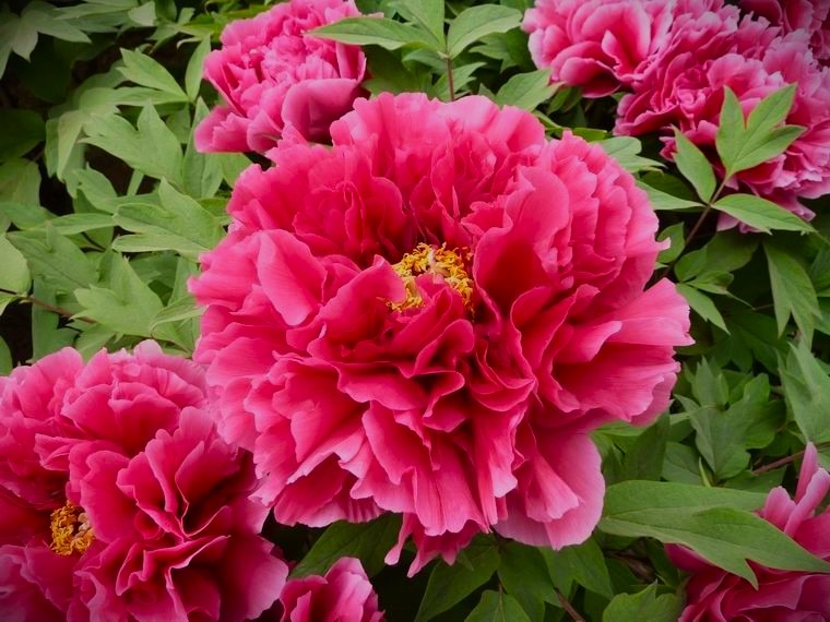 - Пионы используются для посадки многолетних клумб или создания групп растений,а также вдоль забора и стен. Они хорошо сочетаются с лилейниками, астрами или другими луковичными растениями.