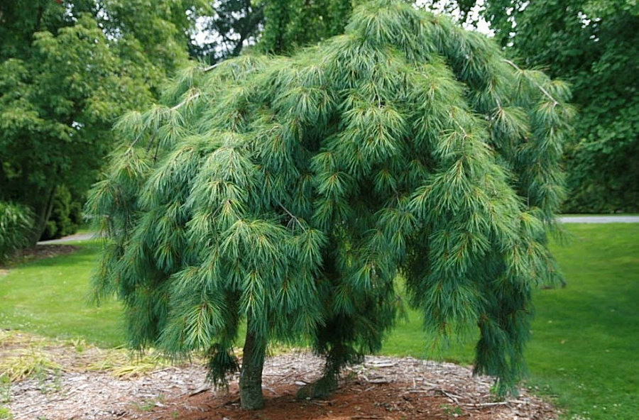 Саженцы сосны веймутовой Pendula — обладатели плакучей кроны, которую необходимо направлять вверх с помощью опоры. Ниспадающие ветви, усеянные мягкими зелёными иголками и длинными фиолетовыми шишками, выгодно подчёркивают изящность и стройность дерева. Рост сосны идёт довольно быстро (30-40 сантиметров в год) и останавливается на отметке в 4 метра.