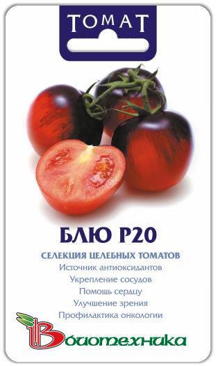 Семена томата "Блю Р20" (Blu R20) позволяют собирать необычные по внешнему виду плоды, отличающиеся целебными свойствами. Сорт относится к средней степени созревания, поскольку плоды созревают на 111 – 115 день после появления всходов. Плоды круглой формы и весом около 80 грамм, окрашены в темно-синий цвет. Темная окраска на плоде появляется под воздействием прямых солнечных лучей, в места, где солнце меньше попадает, урожай будет менее темным или красным. Цвет внутренней части томата красно-розовый. Мякоть плотная, ароматная. Содержание витамина C в этом сорте несколько выше, чем в помидорах красного цвета.