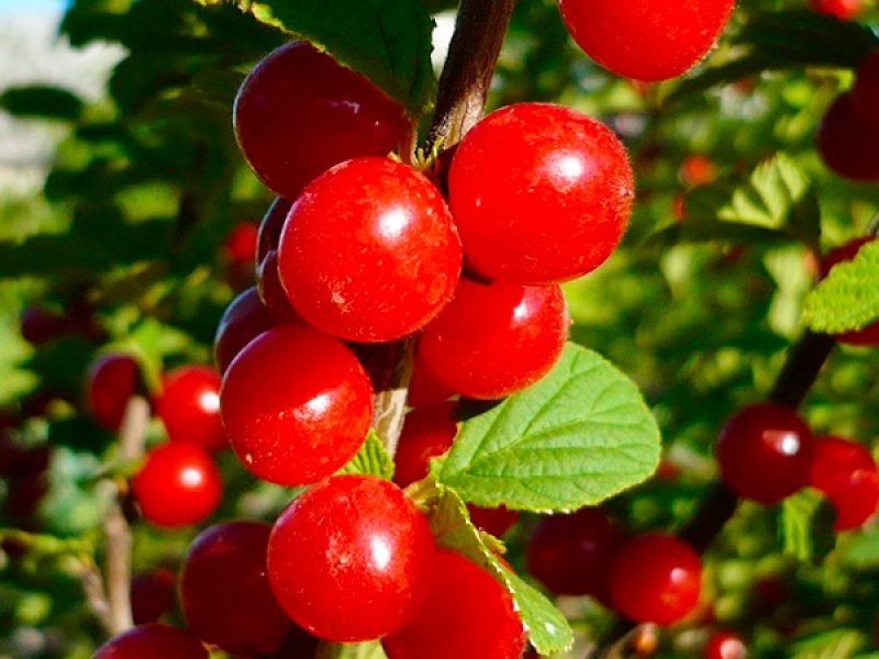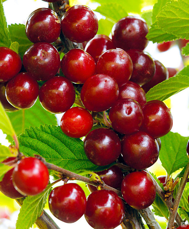 Саженцы вишни войлочная Царевна растут кустовым (не выше 2,5 метра) раскидистым растением. Декоративны и листва с четким резным контуром, и цветы, которые в период цветения покрывают ветвь полностью. Декоративность куста сочетается с высокой урожайностью, привитые крупномеры плодоносят уже на второй год. С 19 июля массово зреют крупные (массой 3-4 г) овальные кисловатые ягоды с ворсинистой кожицей. Спелые вишни не осыпаются.