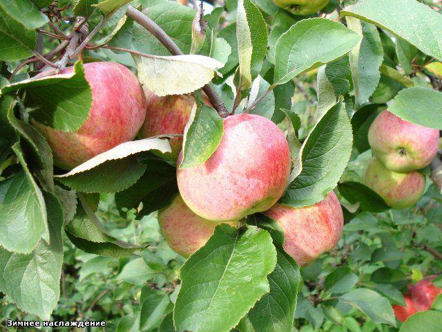 - период сбора урожая: с конца сентября до середины октября. Саженцы яблони Зимнее наслаждение порадуют опытных и начинающих садоводов неприхотливостью.