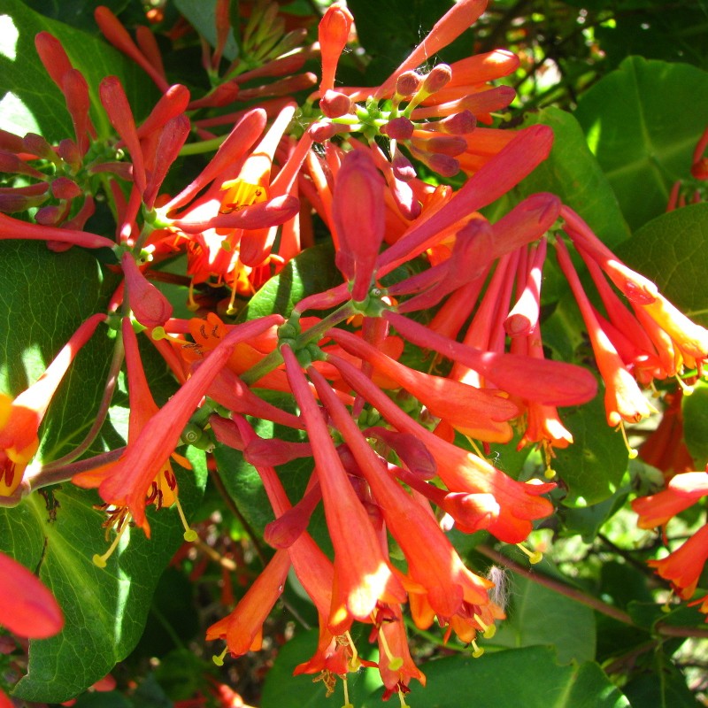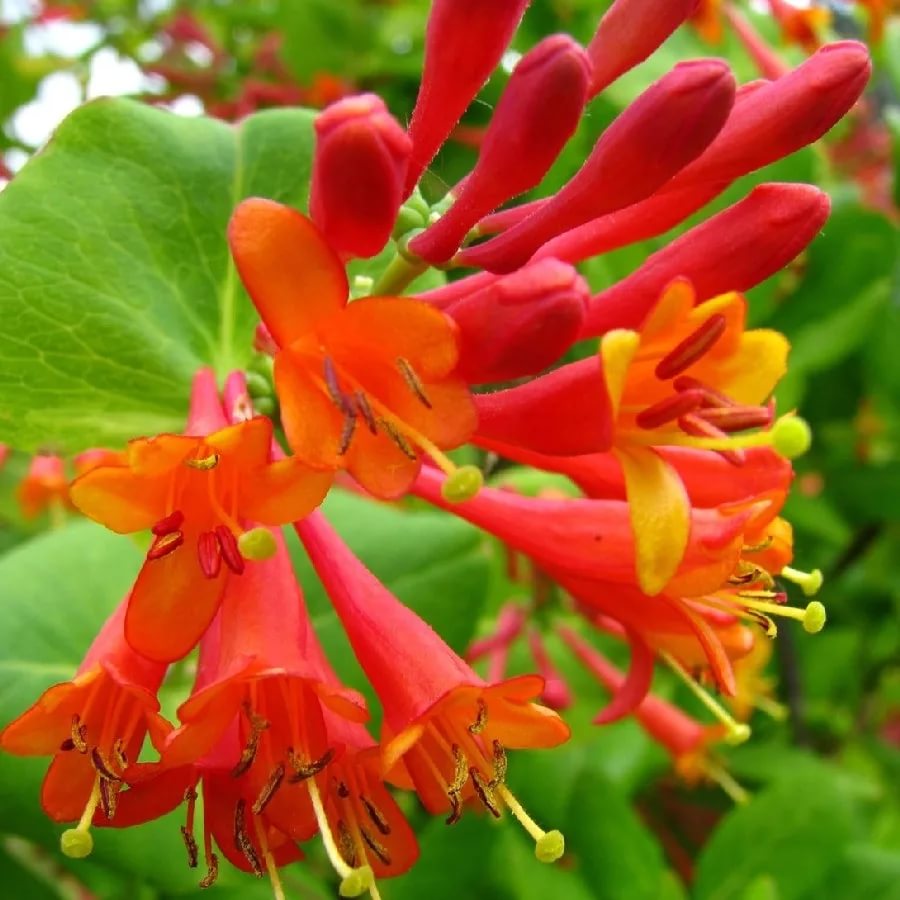 Саженцы жимолости Дропморе Скарлет (Dropmore Scarlet) вырастают слабовьющим кустиком около 2-3 м в высоту. Листва эллиптической формы, темно-зеленого тона, располагается супротивно друг другу. Верхние листочки имеют округлую форму и сросшиеся между собой вокруг стебля. Цветет трубчатыми цветочками ярко-оранжевого окраса с длинными тычинками в середине. Цветение собрано в небольшие пучки. Плюсы жимолости Дропморе Скарлет: